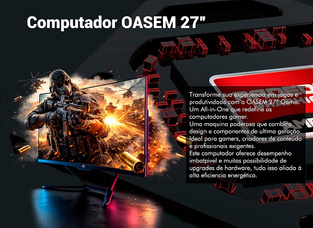 Leve sua performance para o próximo nível com o OASEM 27" All-in-One Gamer. Design, desempenho e inovação ao seu alcance!