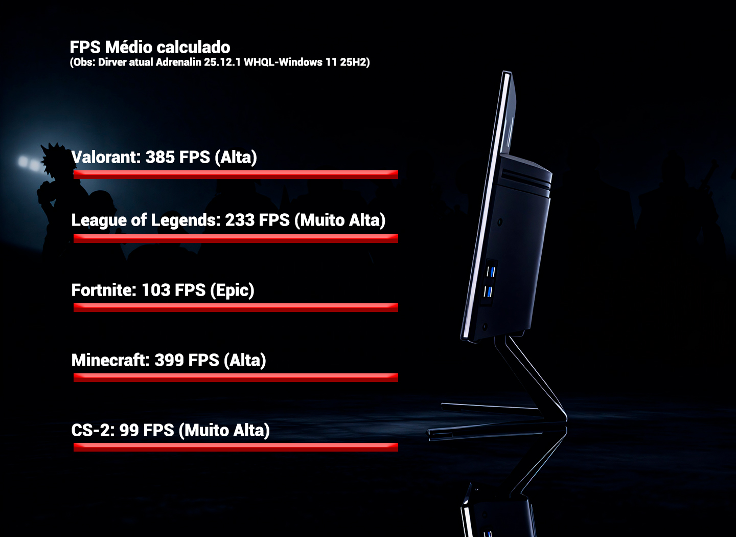 - Gabinete: All-in-One com tela curva integrada de 27", resolução FHD e 165Hz de taxa de atualização.