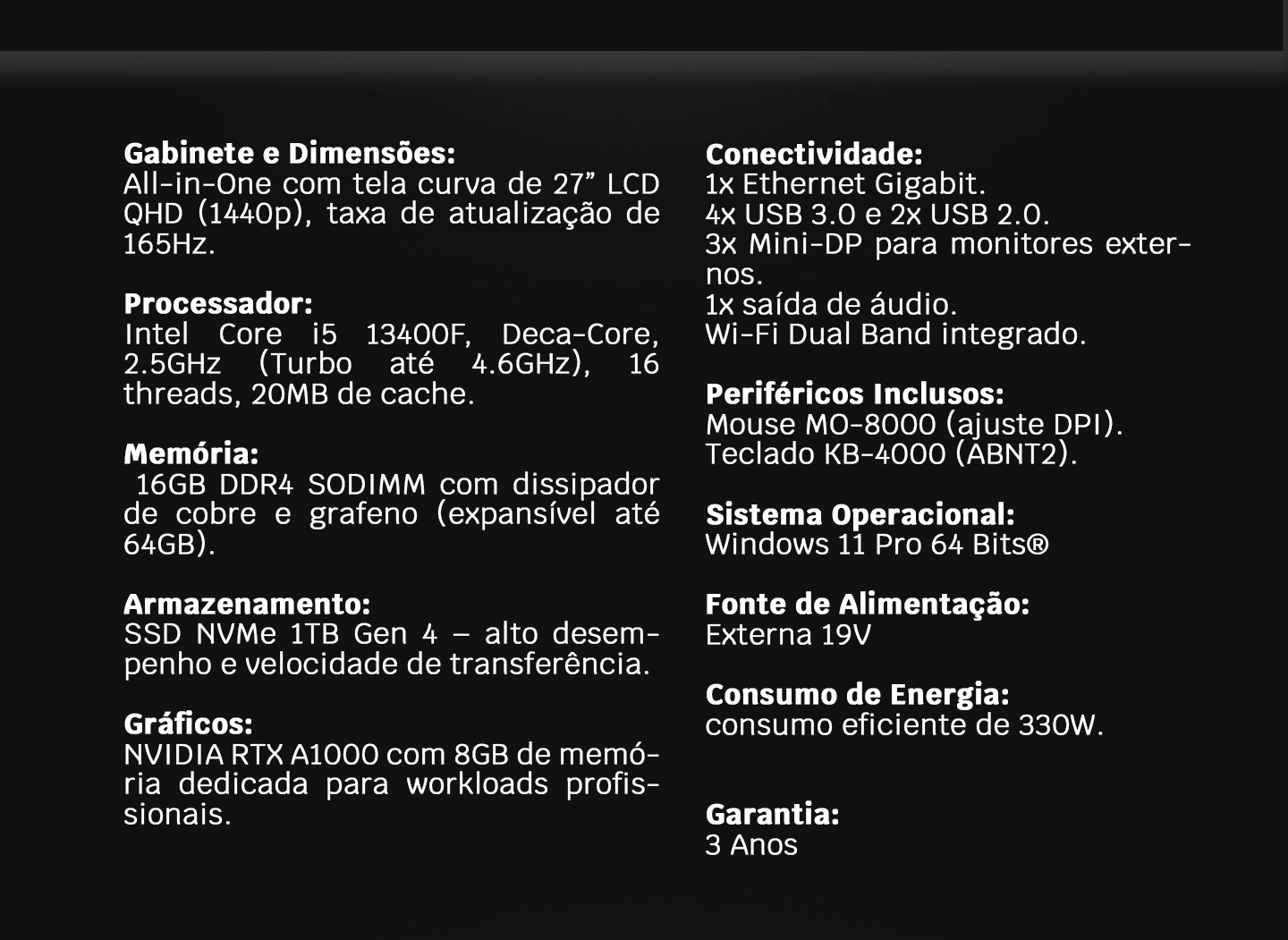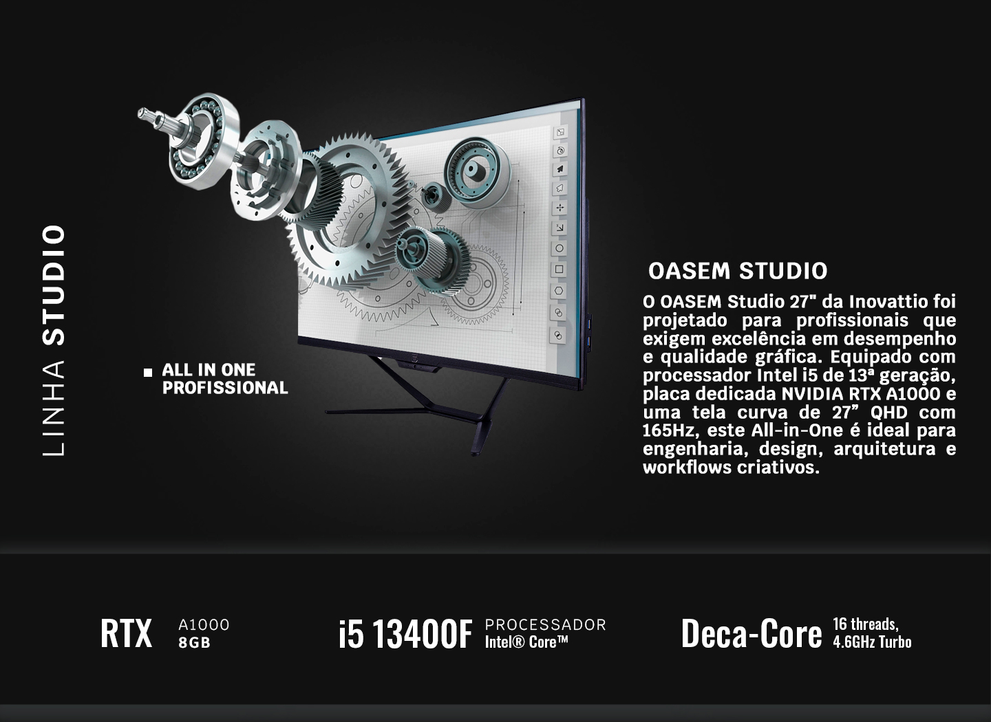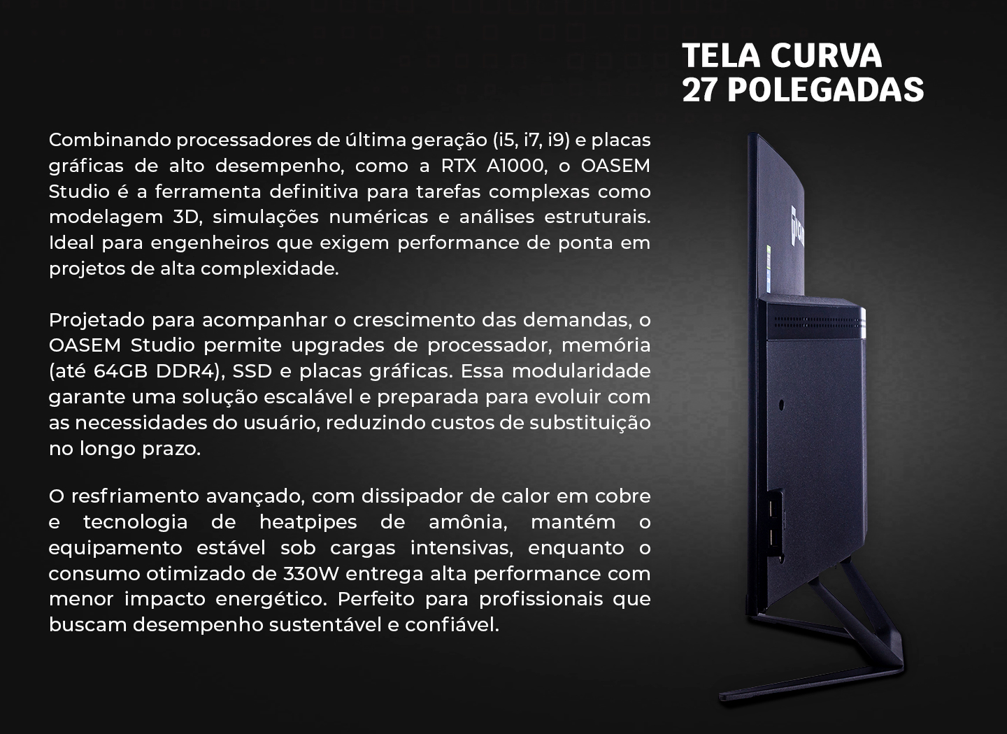 Seja na engenharia, design ou simulações, o OASEM Studio 27″ oferece o equilíbrio perfeito entre potência, versatilidade e eficiência. Combinando tecnologia de ponta, design inovador e capacidade de expansão, este All-in-One é a solução definitiva para profissionais exigentes.
