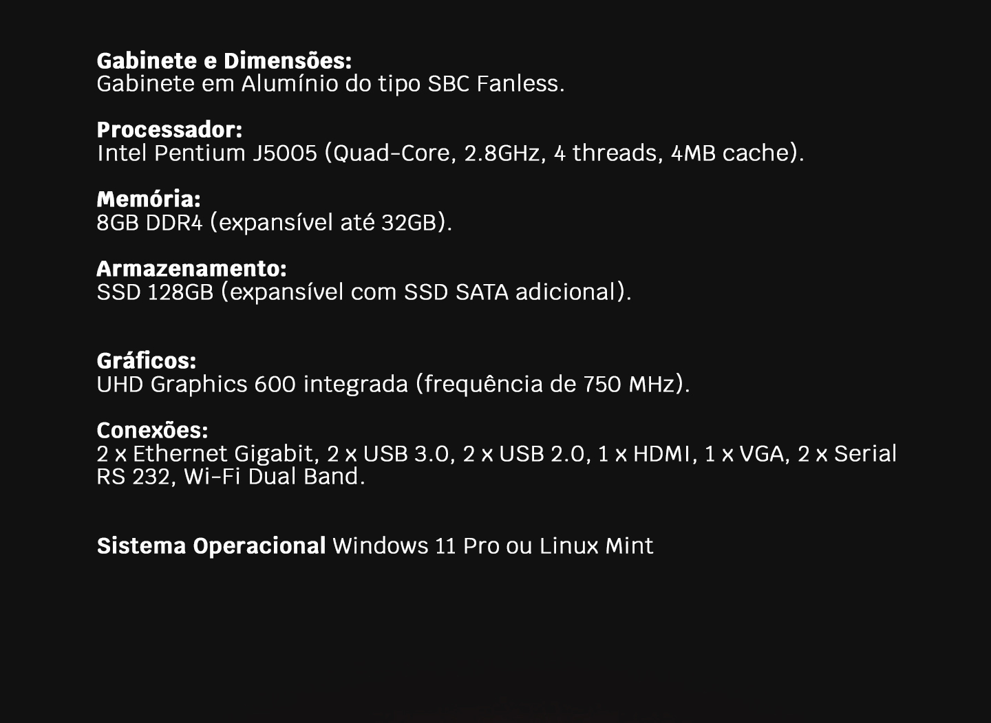 Gabinete: Alumínio industrial tipo SBC, com resfriamento passivo (fanless)